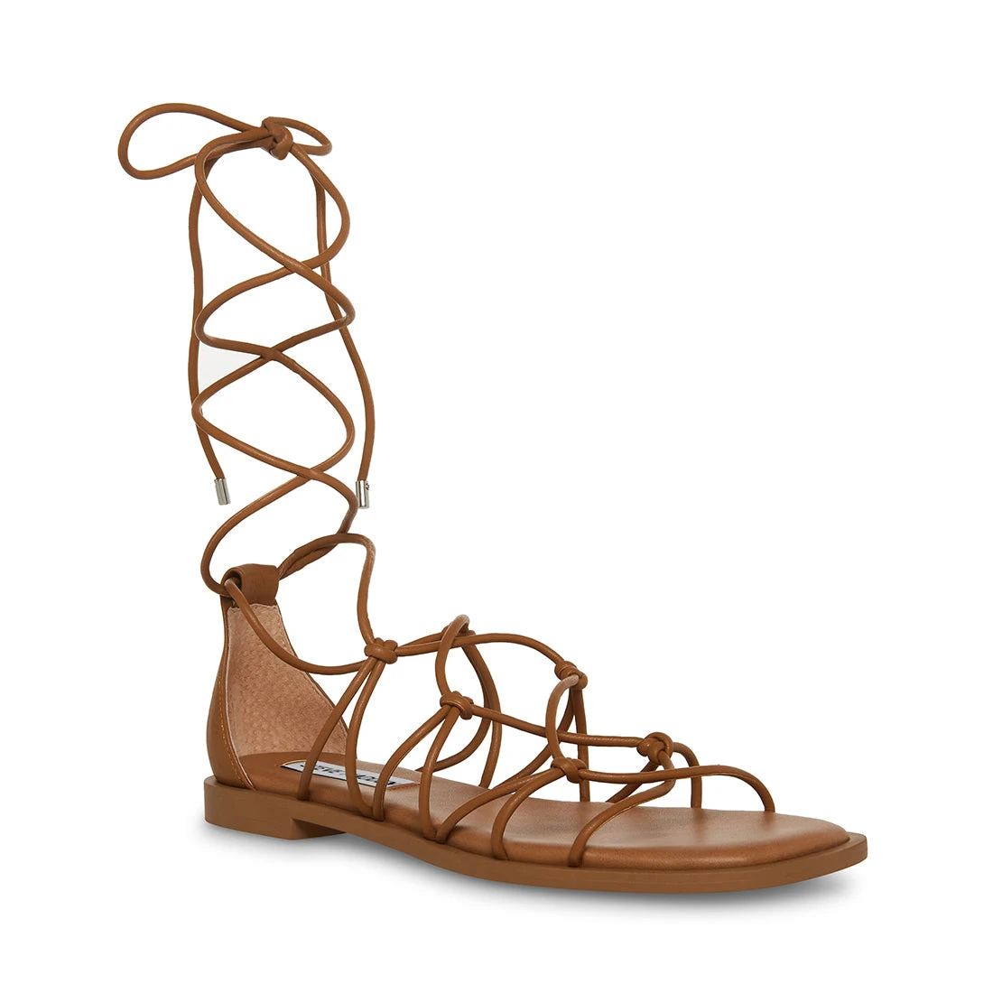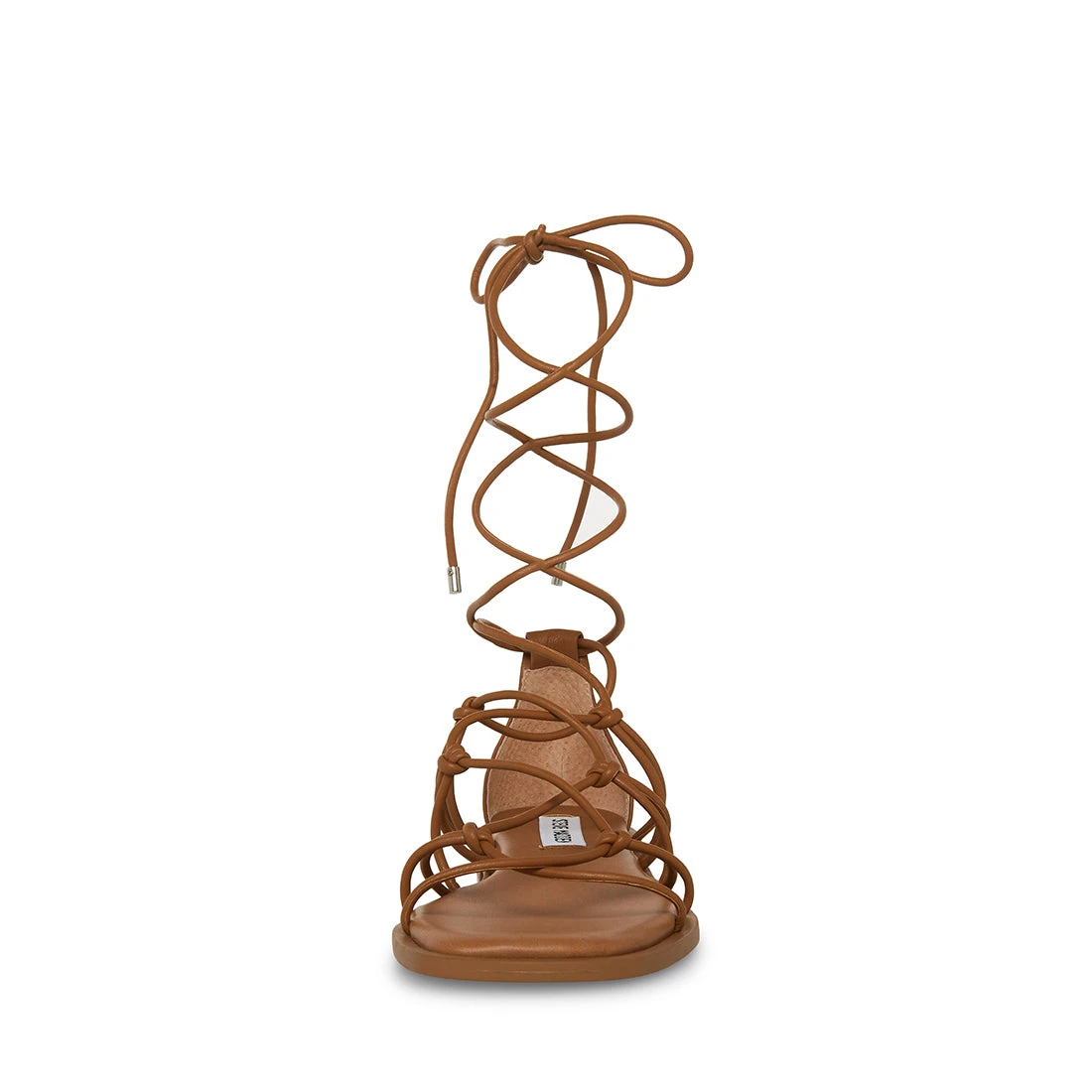The AINSLEY square toe sandals feature cord straps that are knotted and laced up the top of the foot to wrap around the ankle.