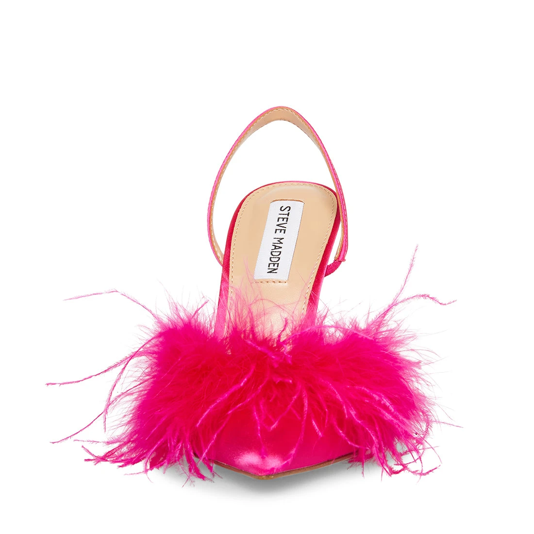 A puff of feathers tops the ALEXIS pump, a soft contrast with the angular pointed toe and extra thin scarpin heel.