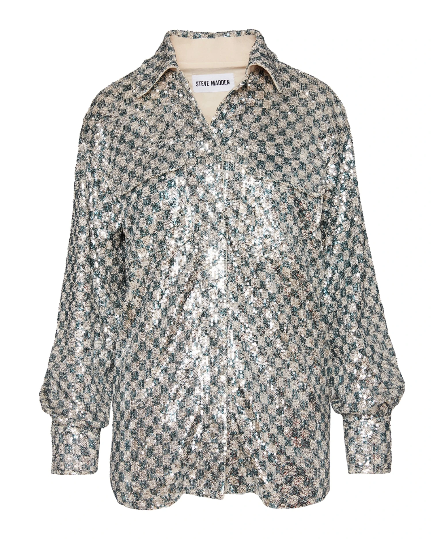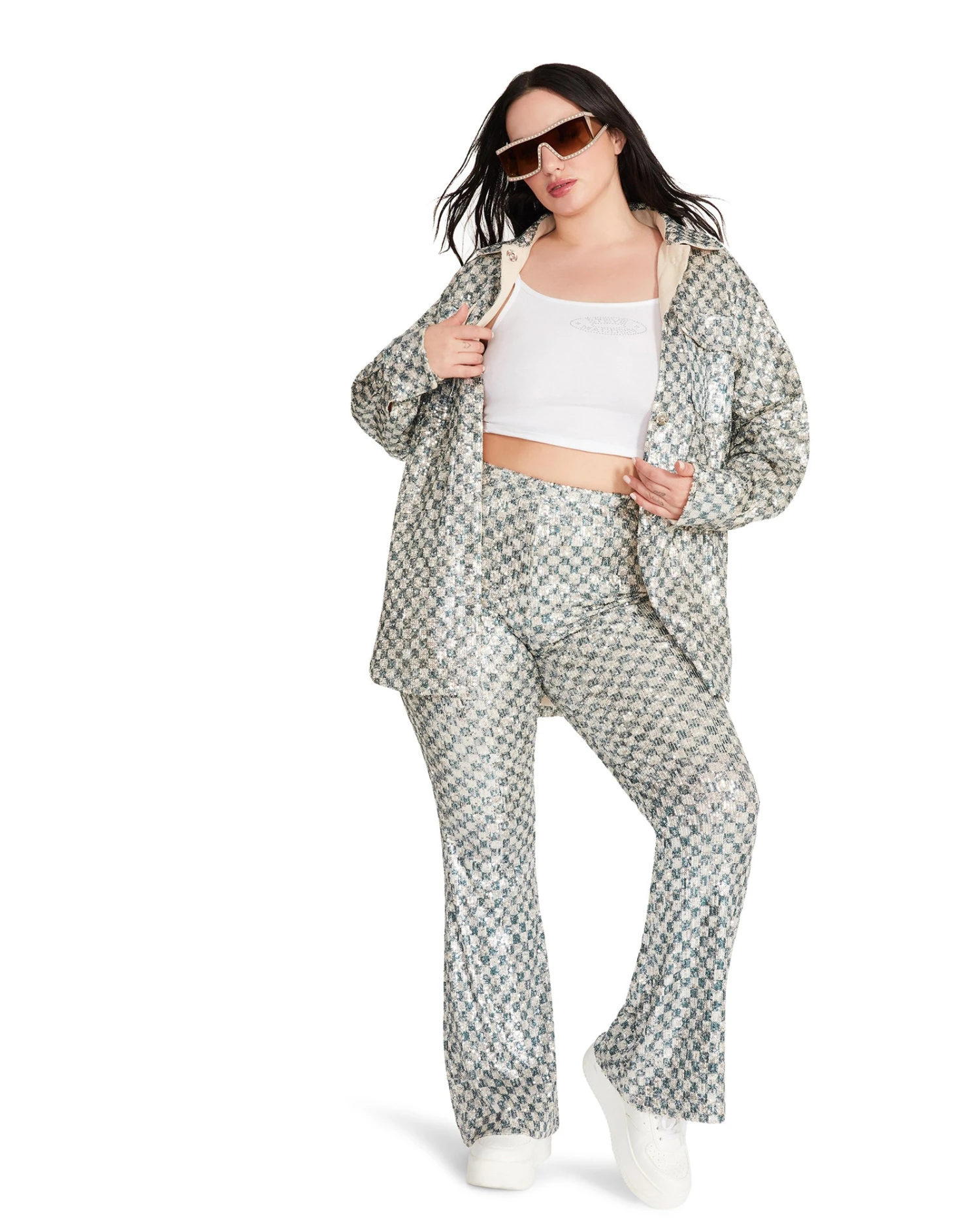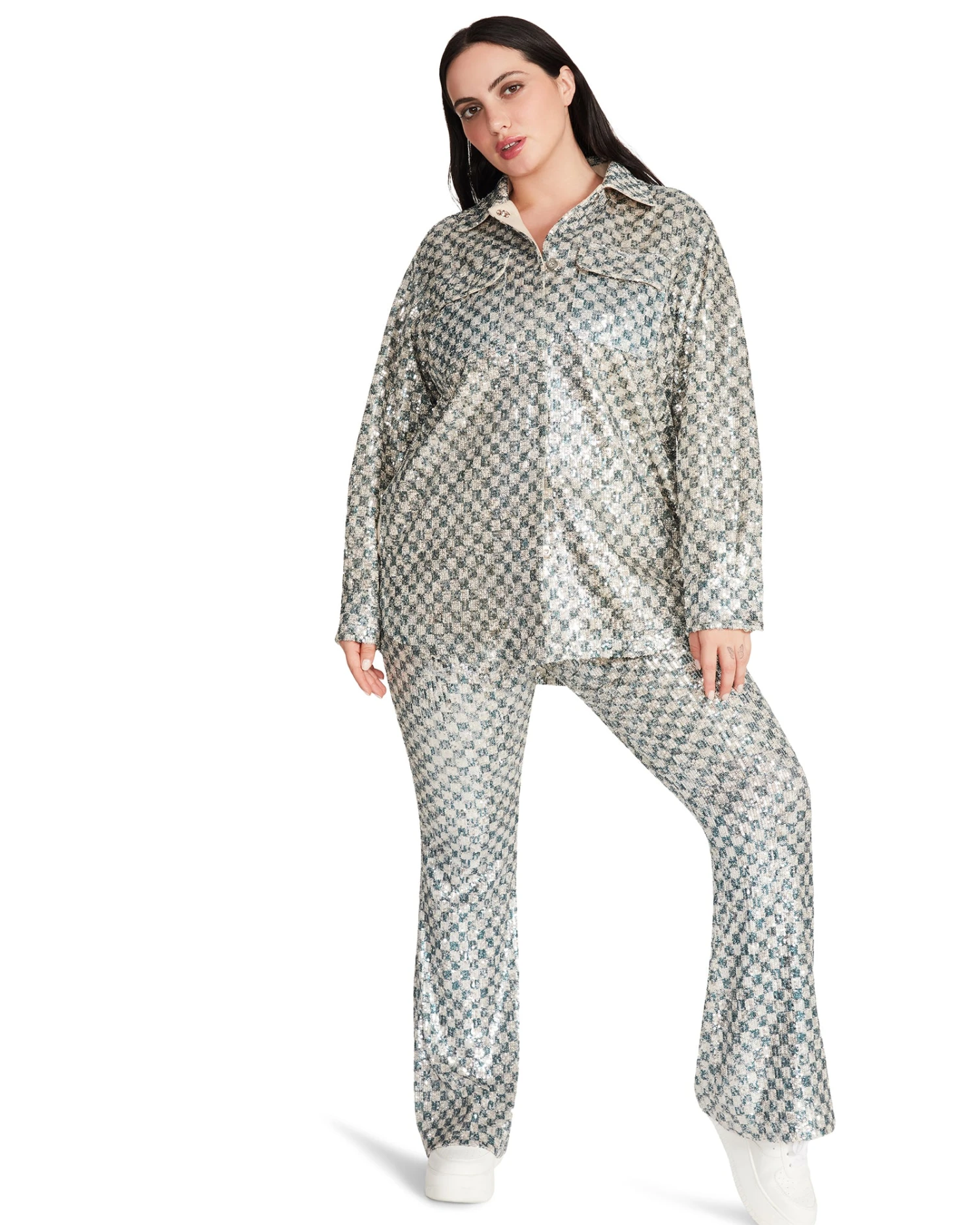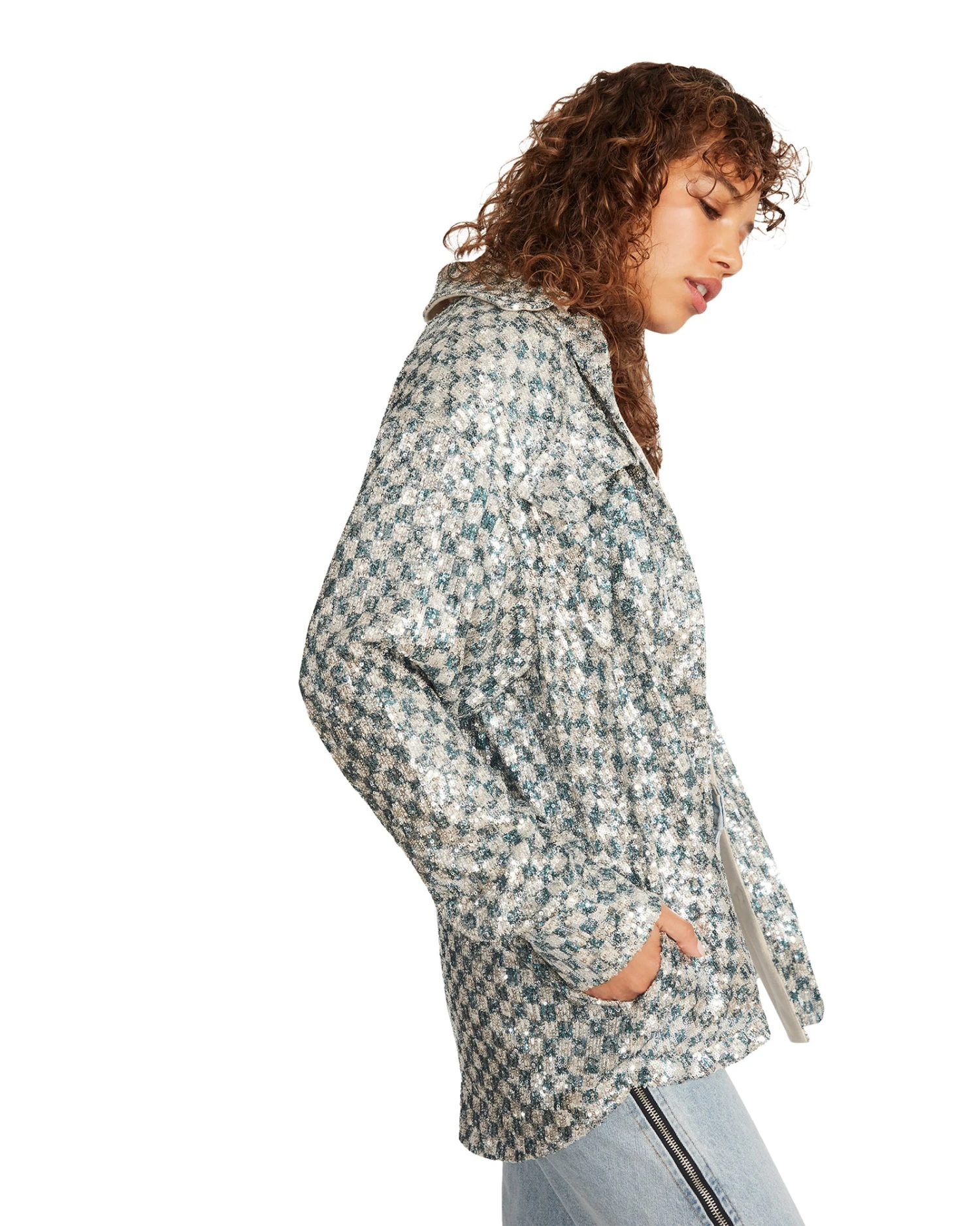 A light layer that packs a big punch, the ANDEE shacket is covered in sparkling mini sequins in a checkered pattern.