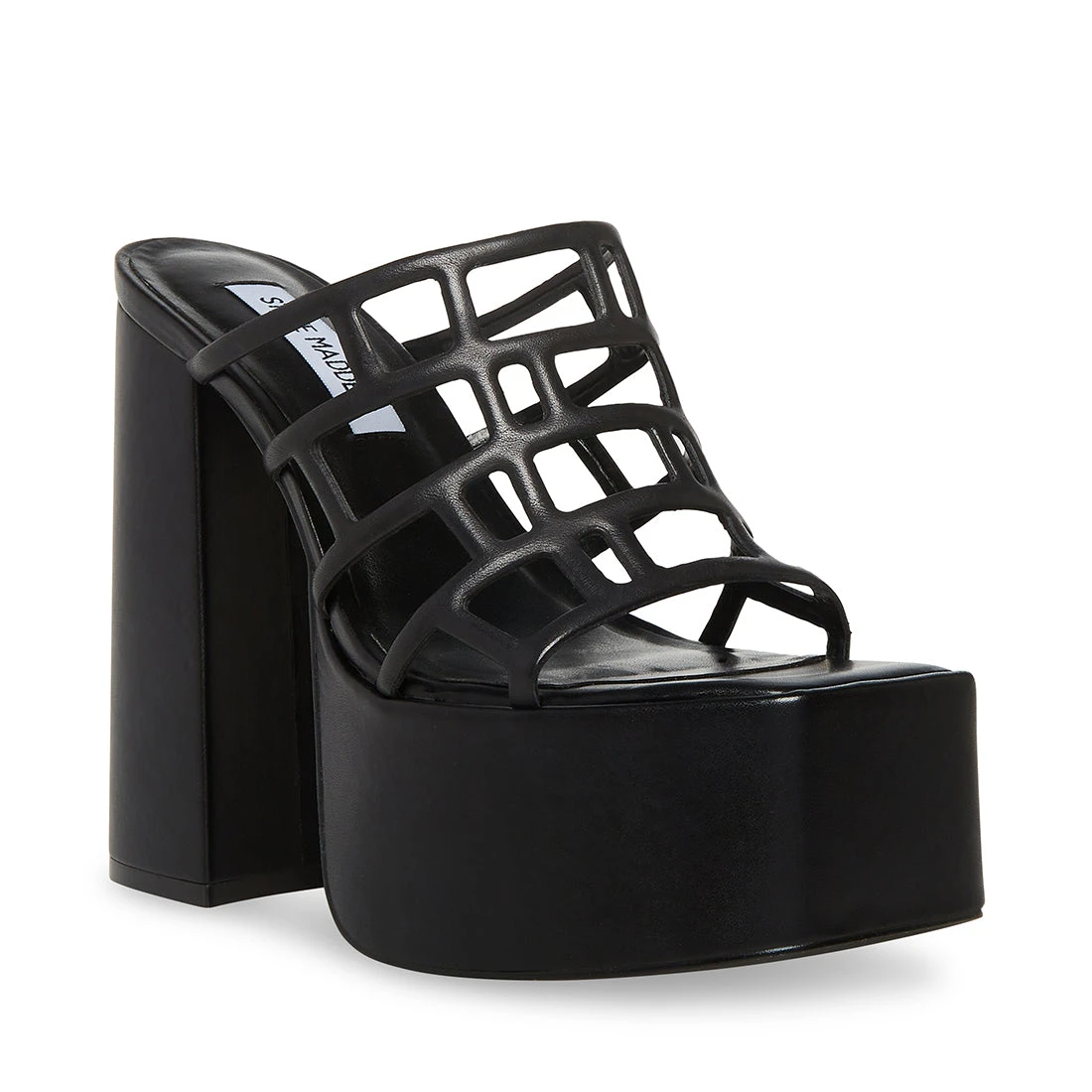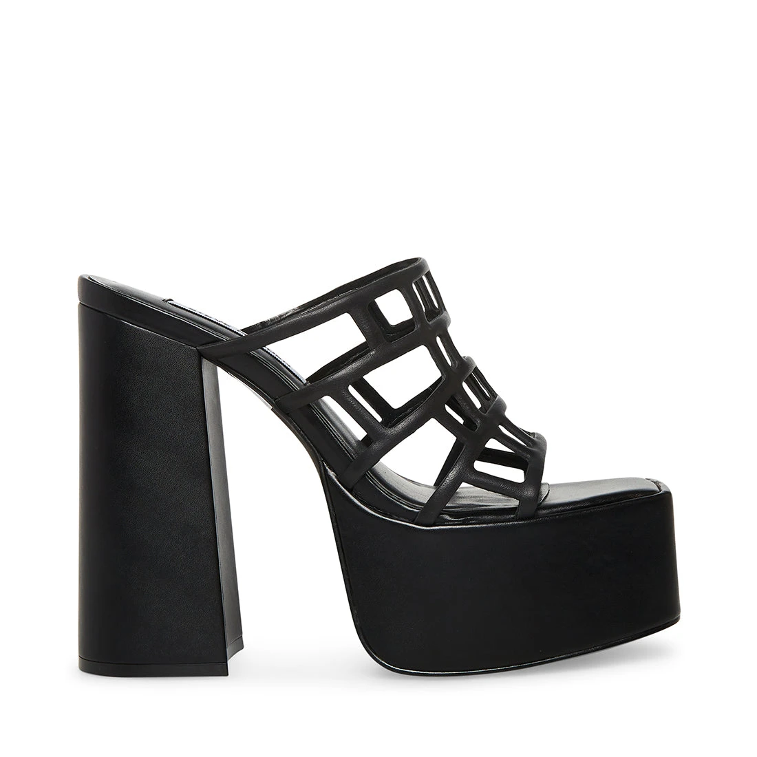 - Geometric cutouts on wide front strap