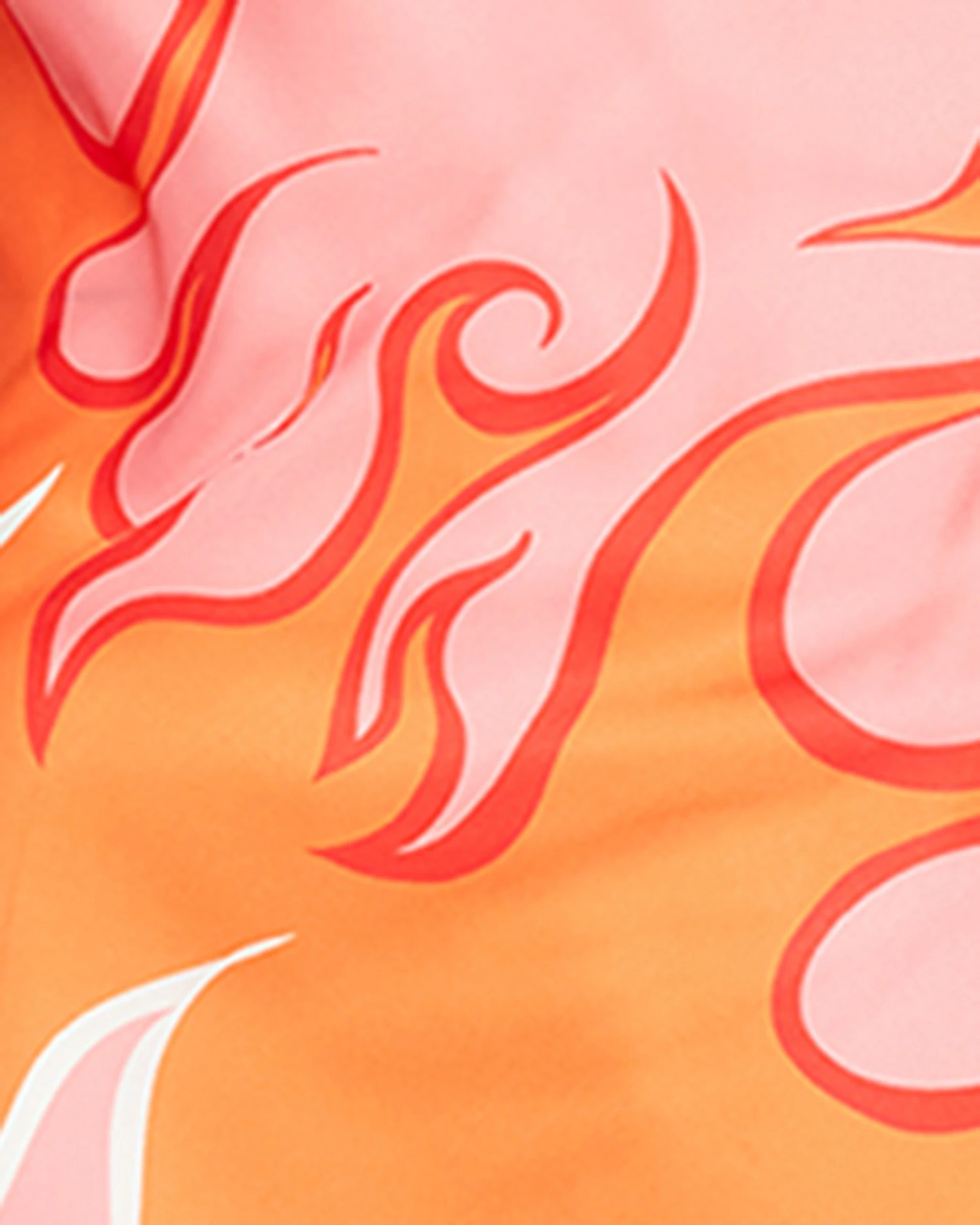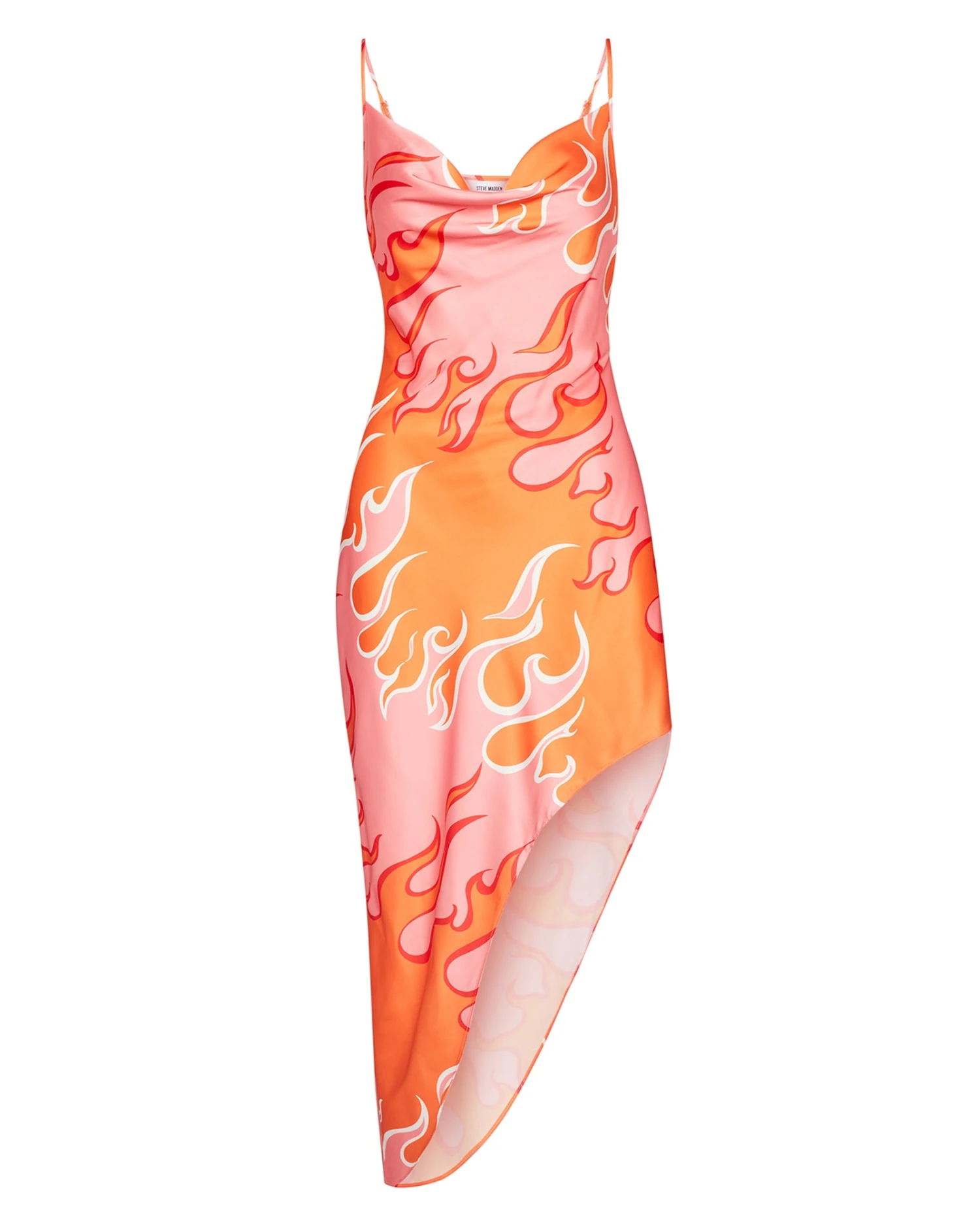 AULORA is a satin slip dress with a flame themed print that extends down to the dramatic asymmetrical hem.