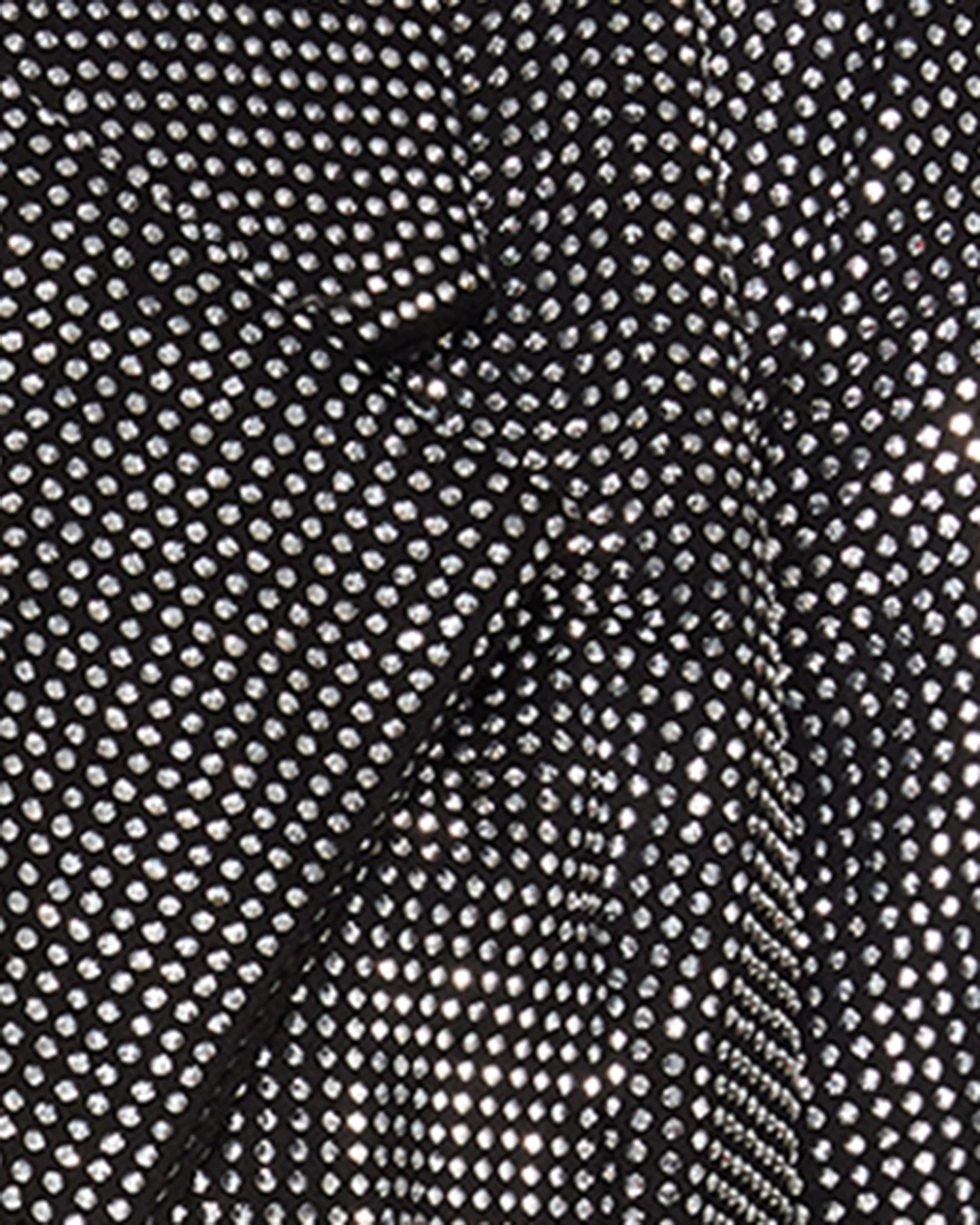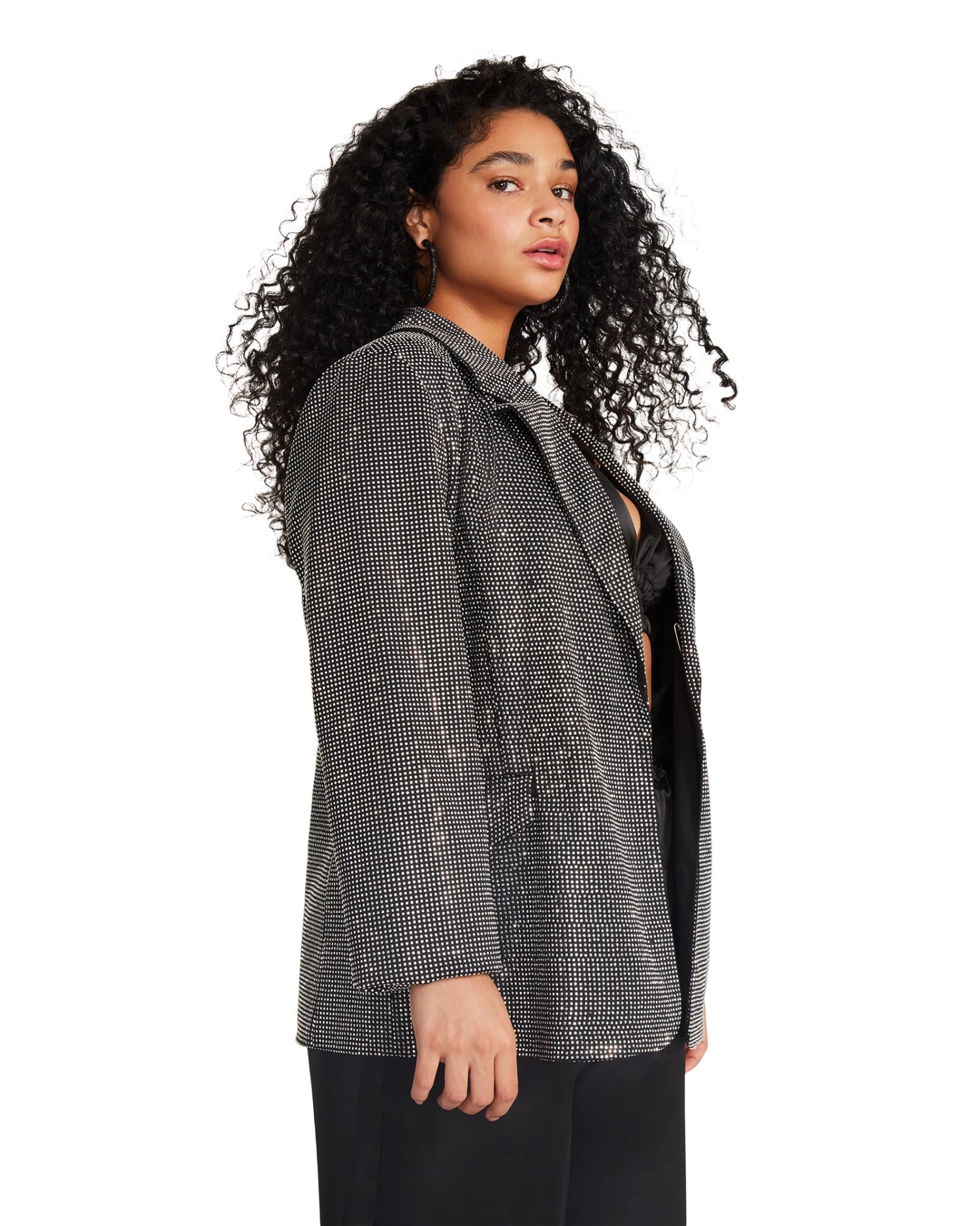 AYA is an open front blazer encrusted in allover rhinestone studs so you can layer a bright burst of sparkle over your look.