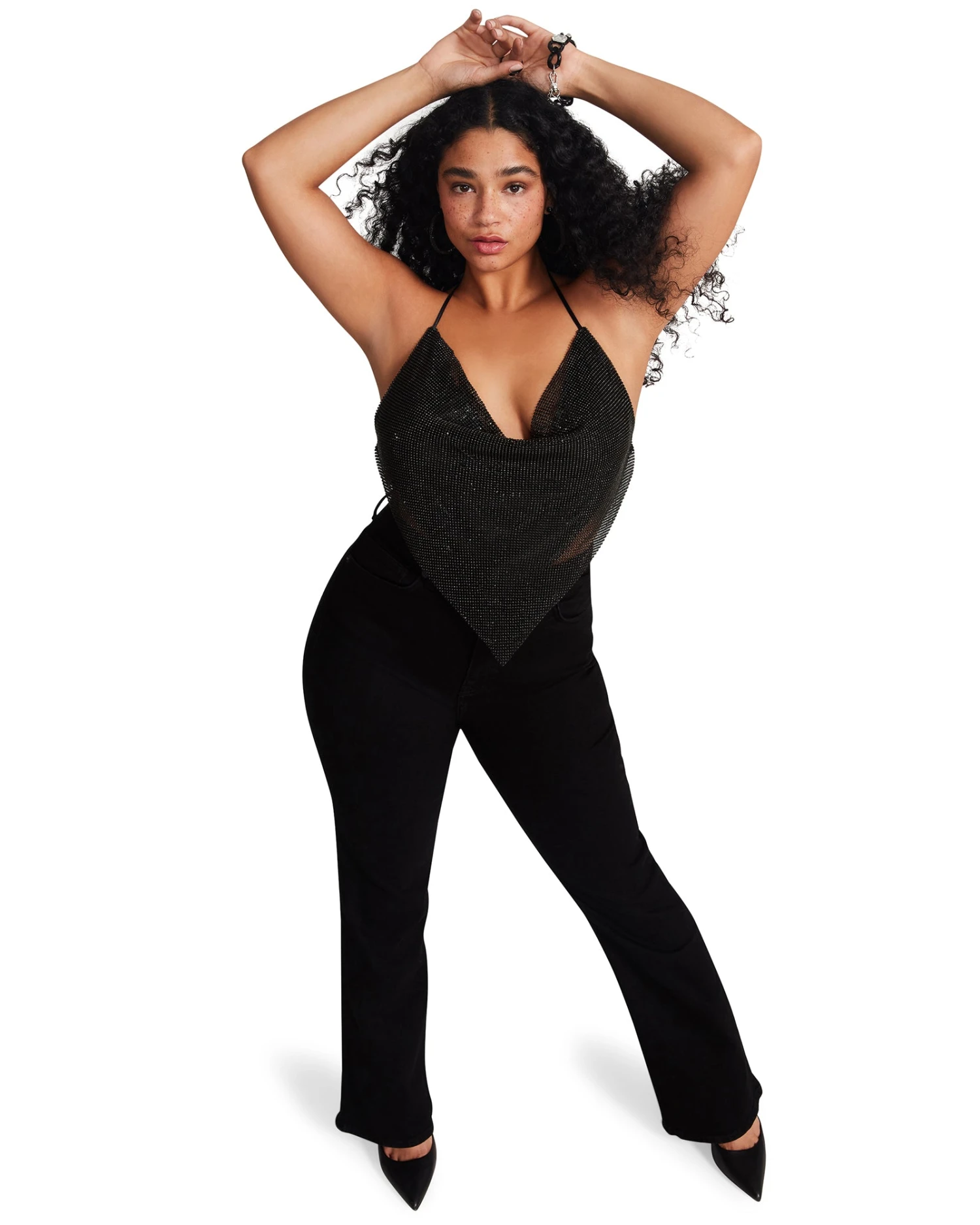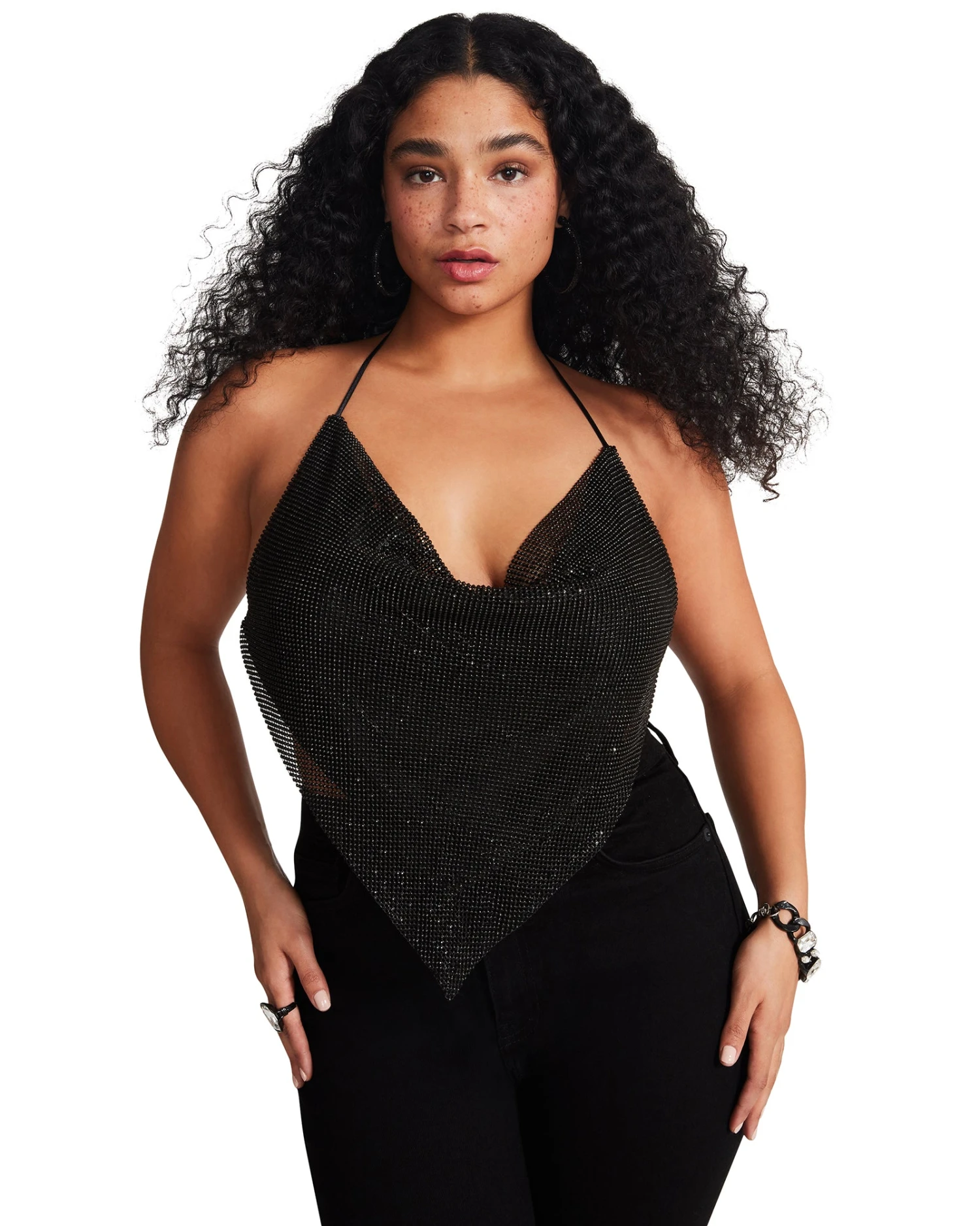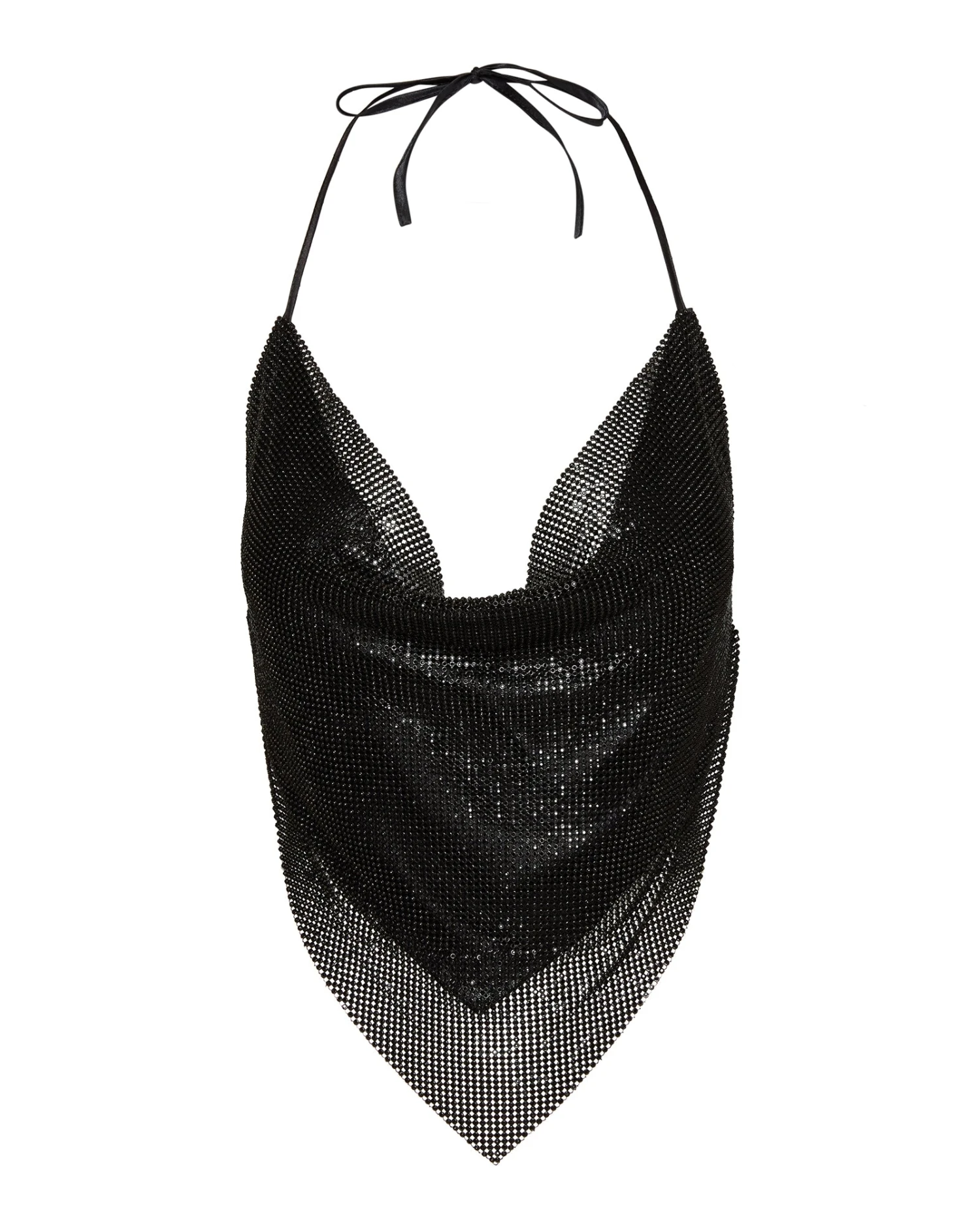 The 2000s called. They want you to have the hottest statement piece. The Barely There Rhinestone Top serves nostalgia with its always classic triangle shape, cowl neck, and rhinestone-studded fabric.