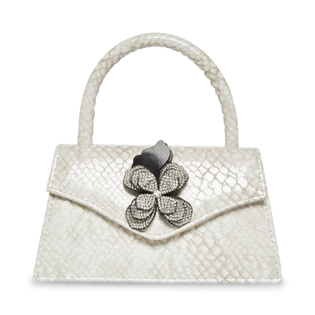 A rhinestone flower at the center of the top flap of the BDANIELA accents this structured top handle handbag with an extra touch of sparkle.