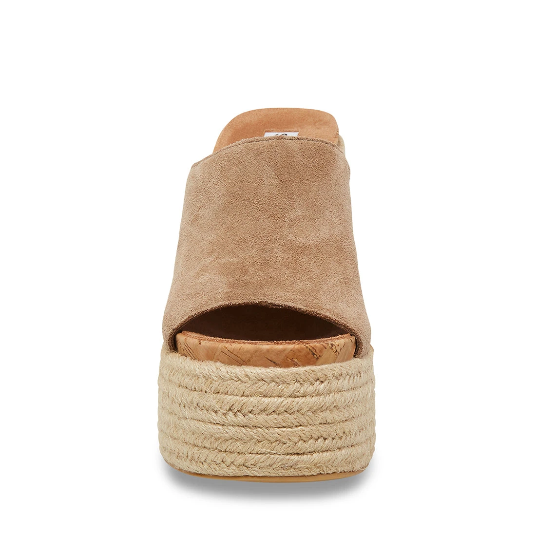 A wide suede strap secures the BECCA sandal to a platform heel sole wrapped in raffia braid.