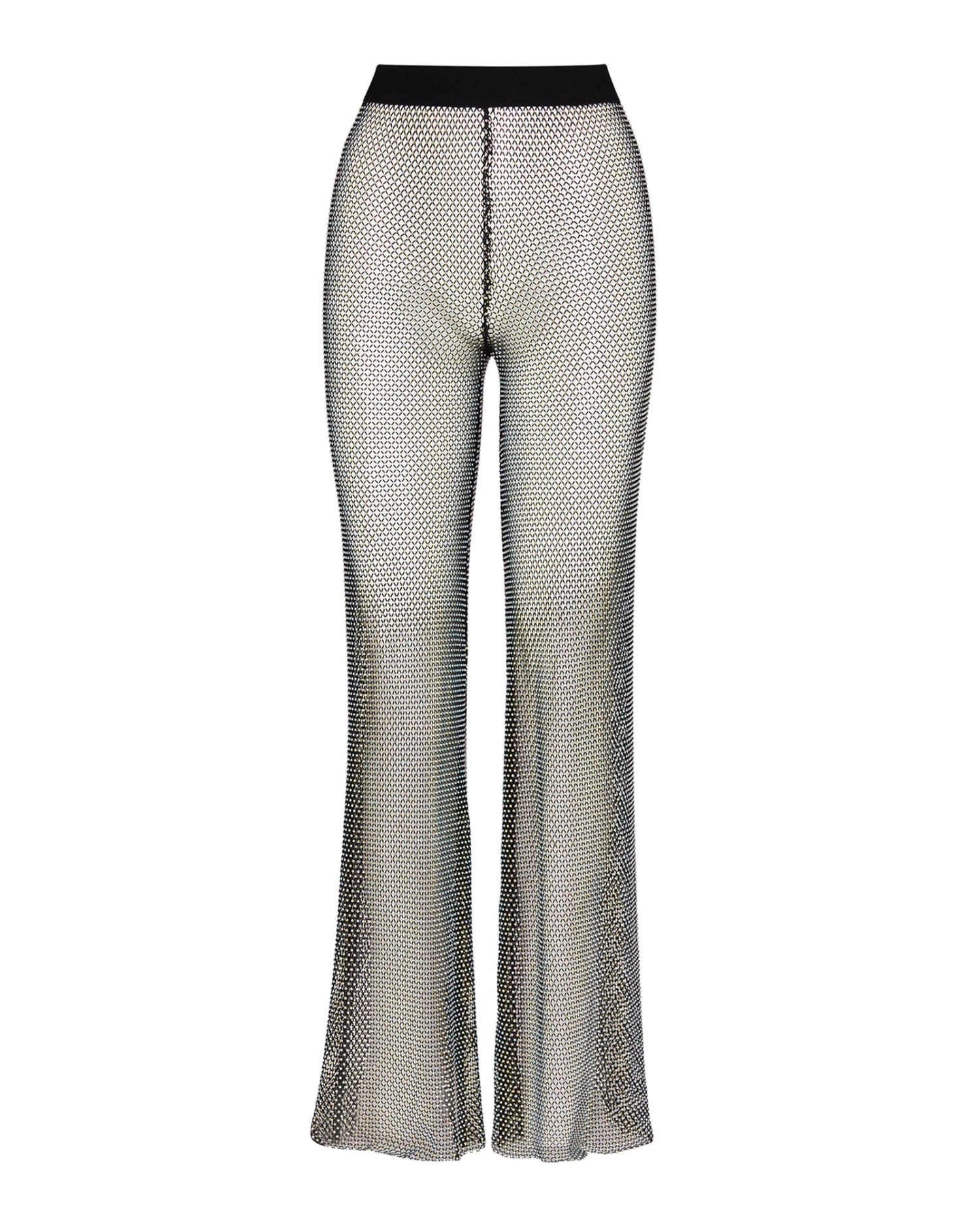 The CHARLIZE pant is a sheer look that sparkles with every movement of the rhinestone mesh fabric.