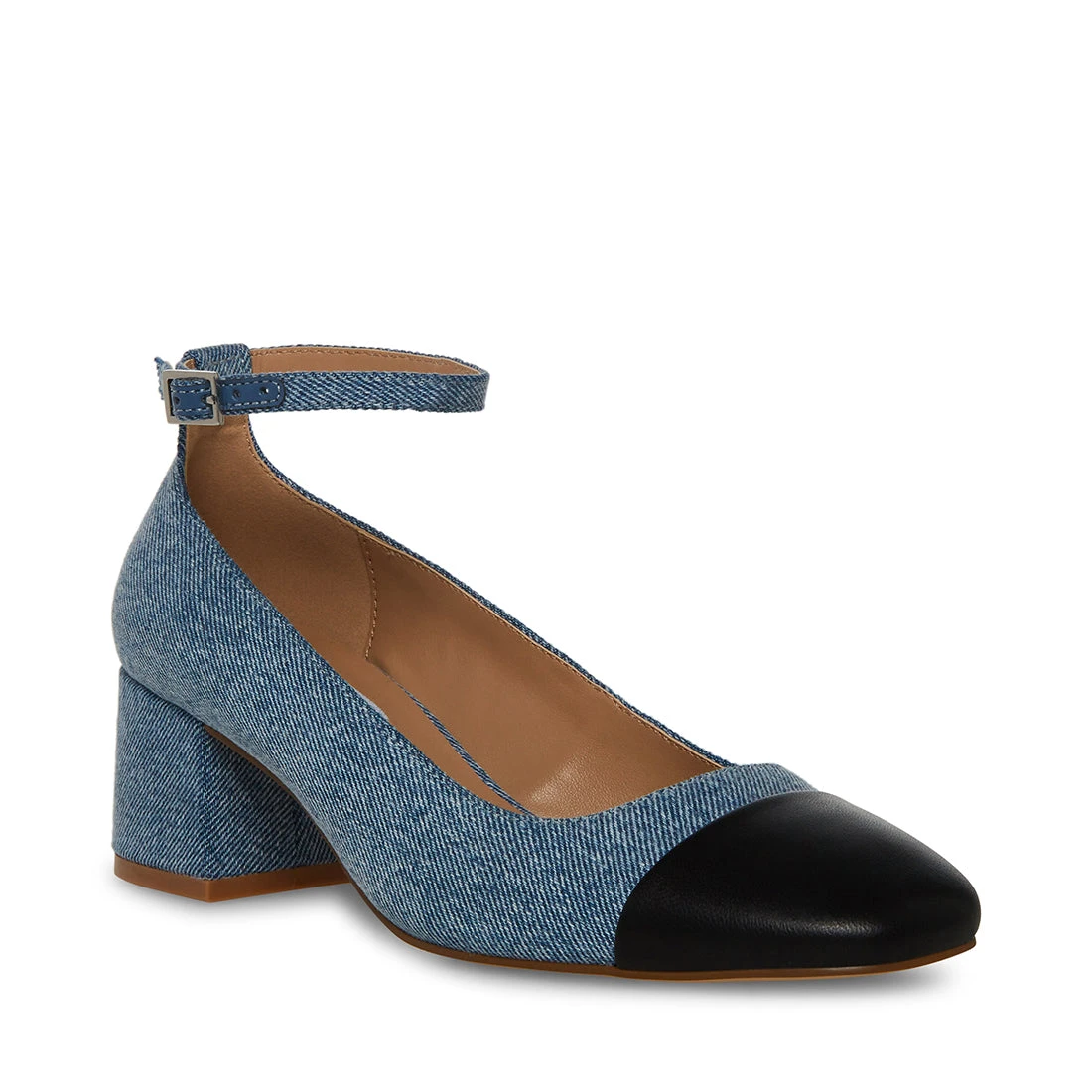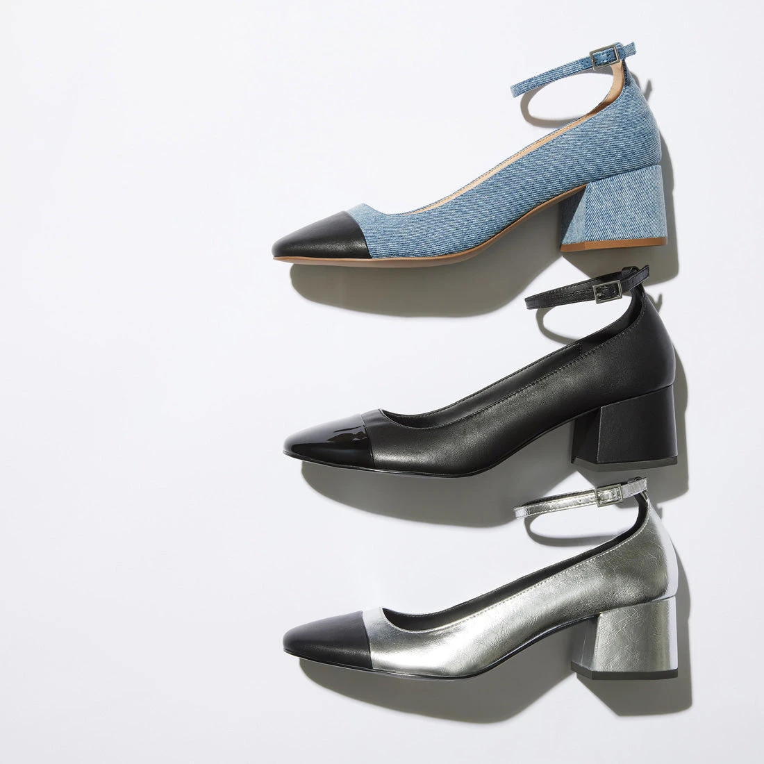 The ELI pump is set on an easy block heel and secured with a slender ankle strap, with a contrasting toe cap finishing this sleek look.