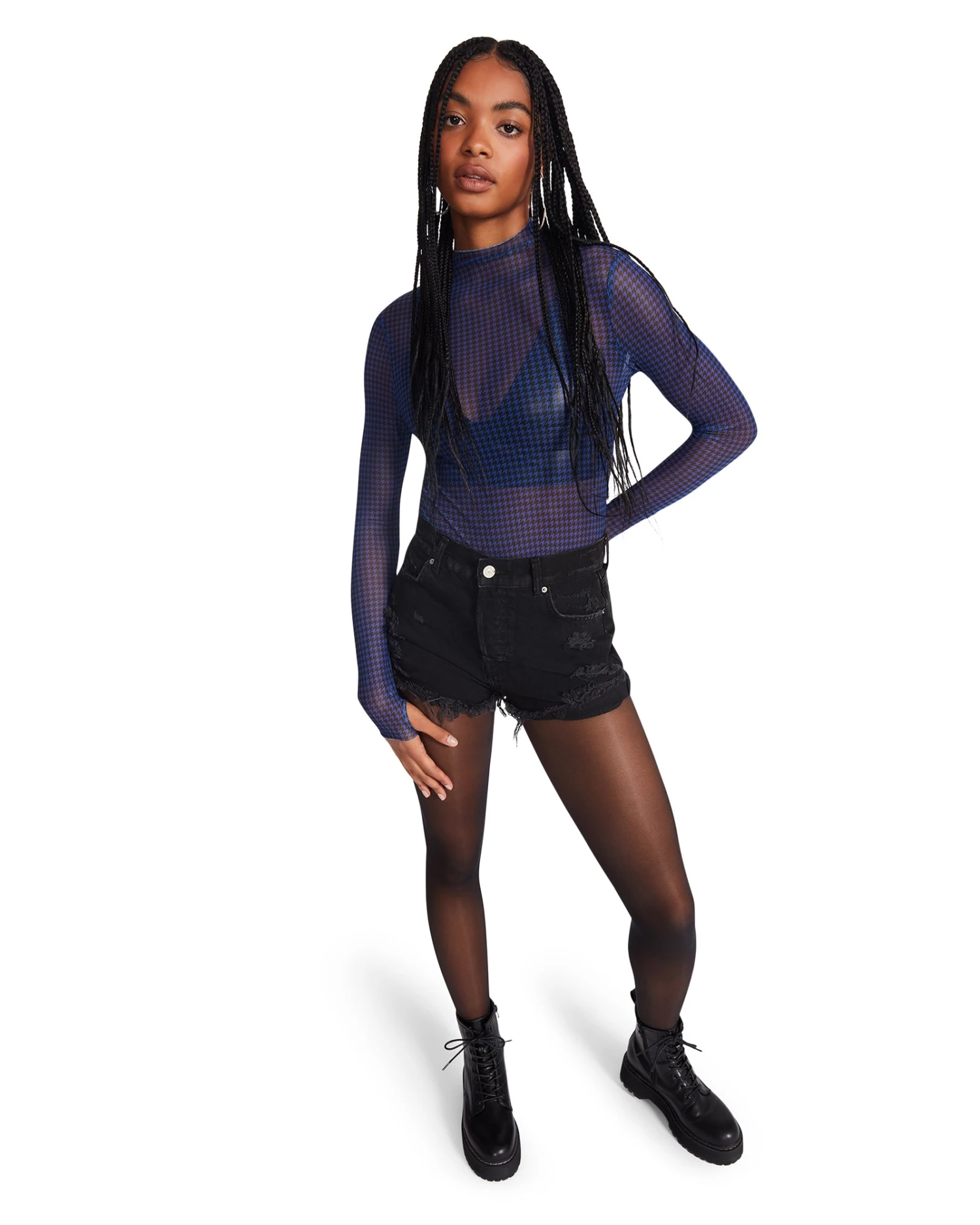 The ELIZA top uses sheer stretch mesh fabric in a houndstooth pattern for its long sleeve mock neck design.
