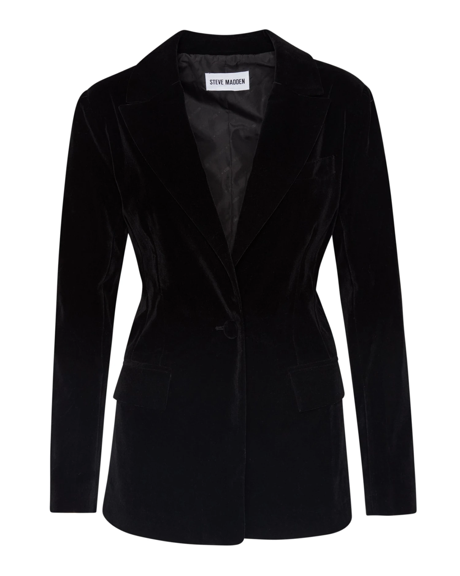 Clean lines define the elongated silhouette and tailored details of the HARLOW velvet blazer.