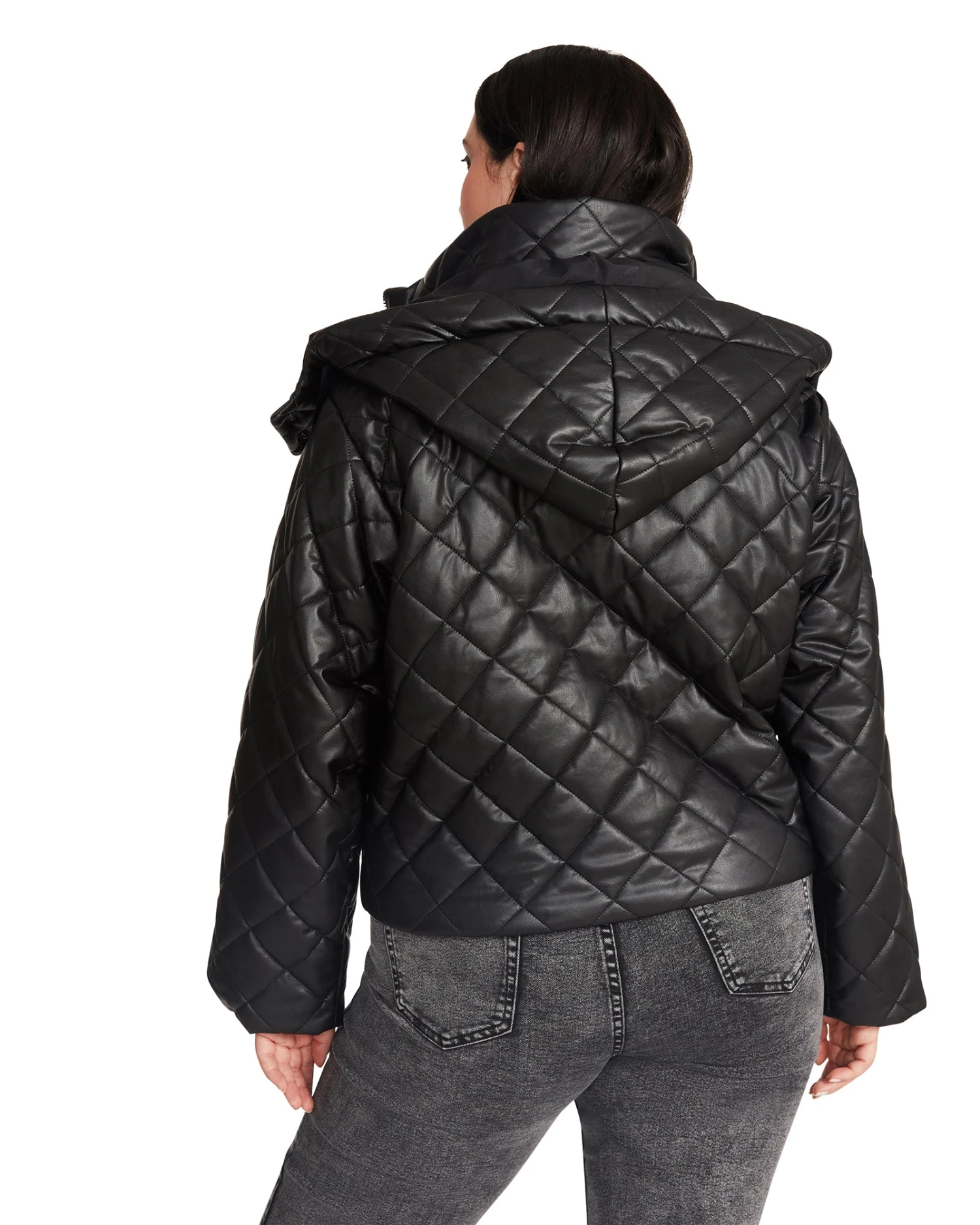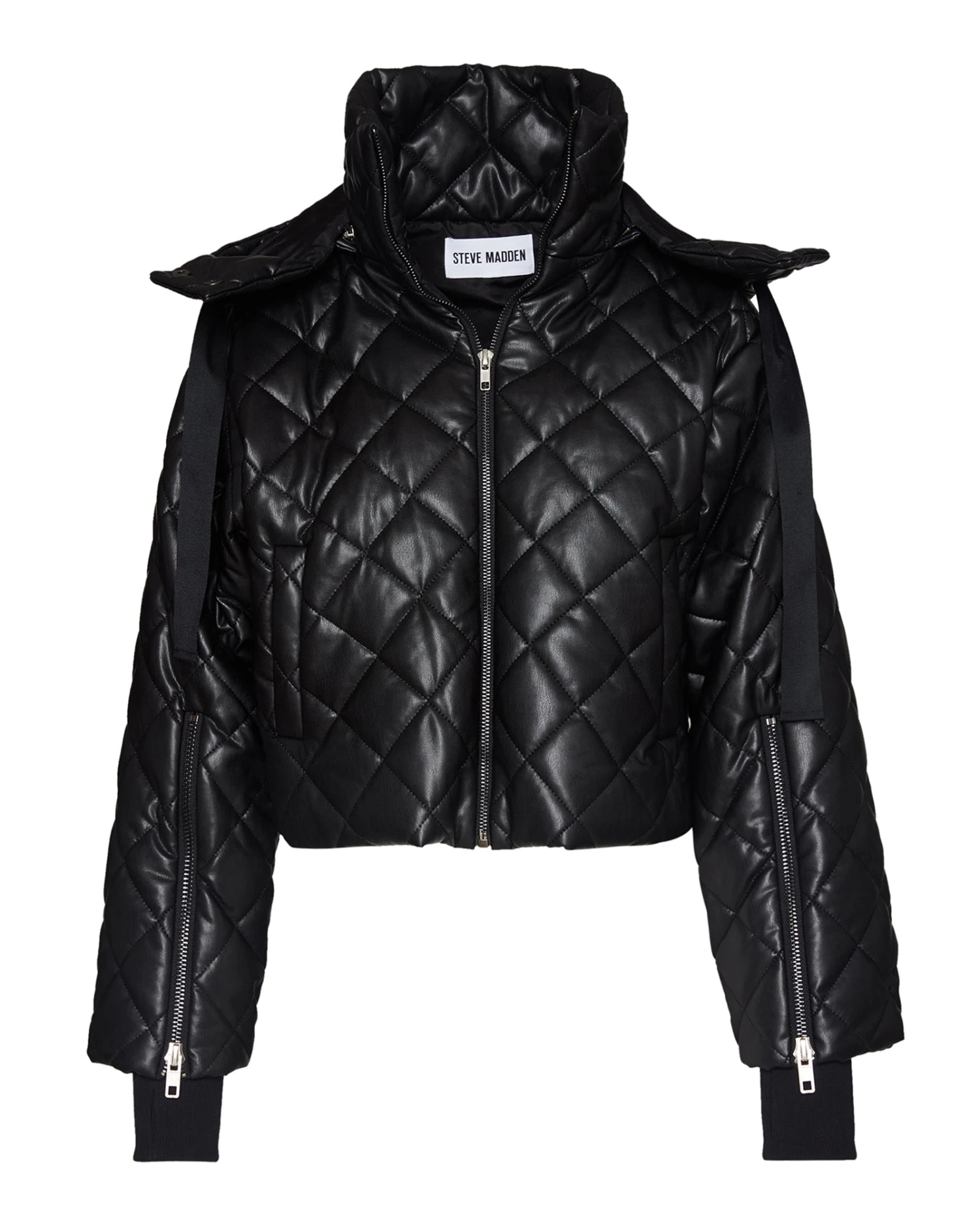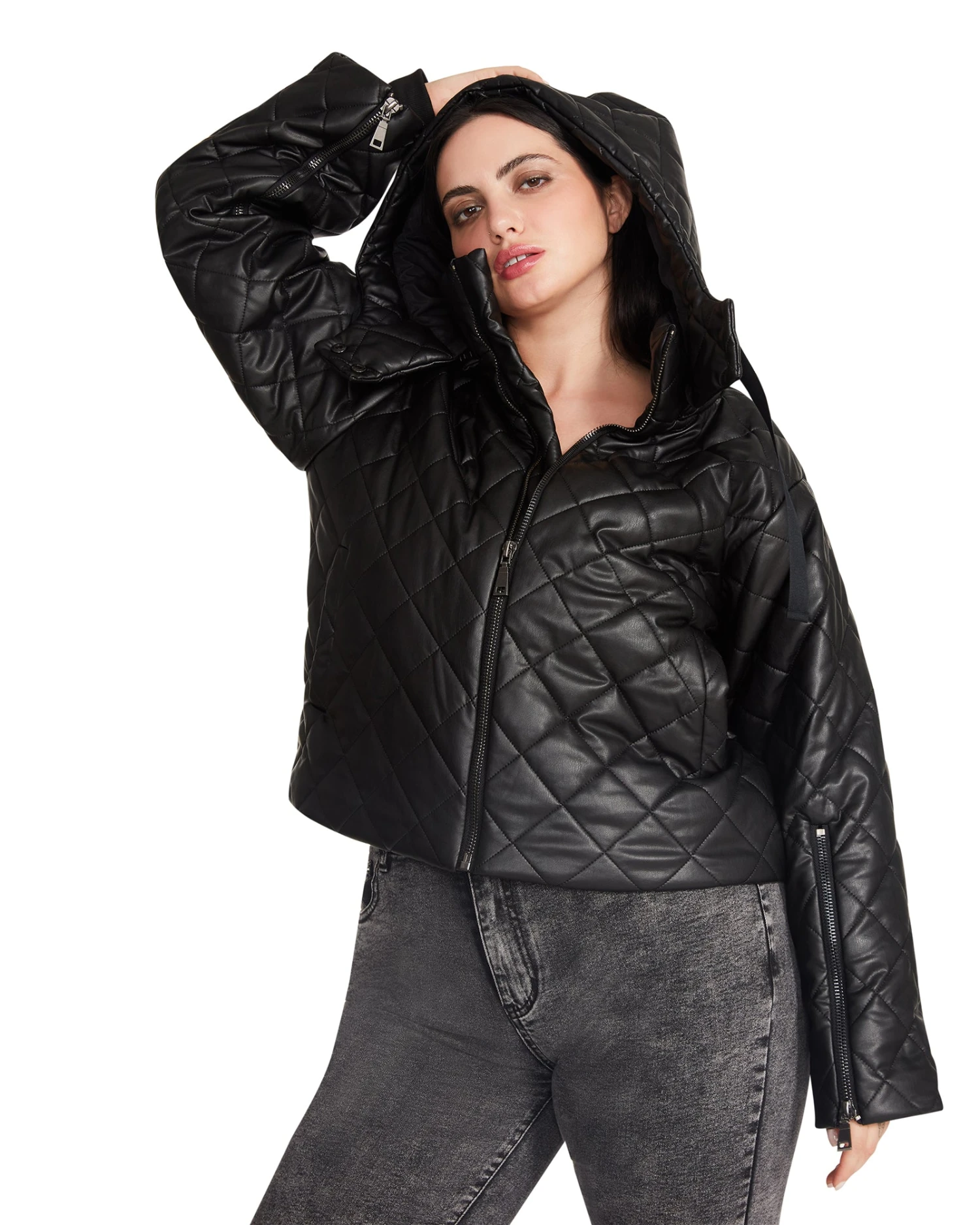 The cropped HAYLE jacket is a fully lined hooded jacket with a quilted shell in vegan leather for a protective outer layer.
