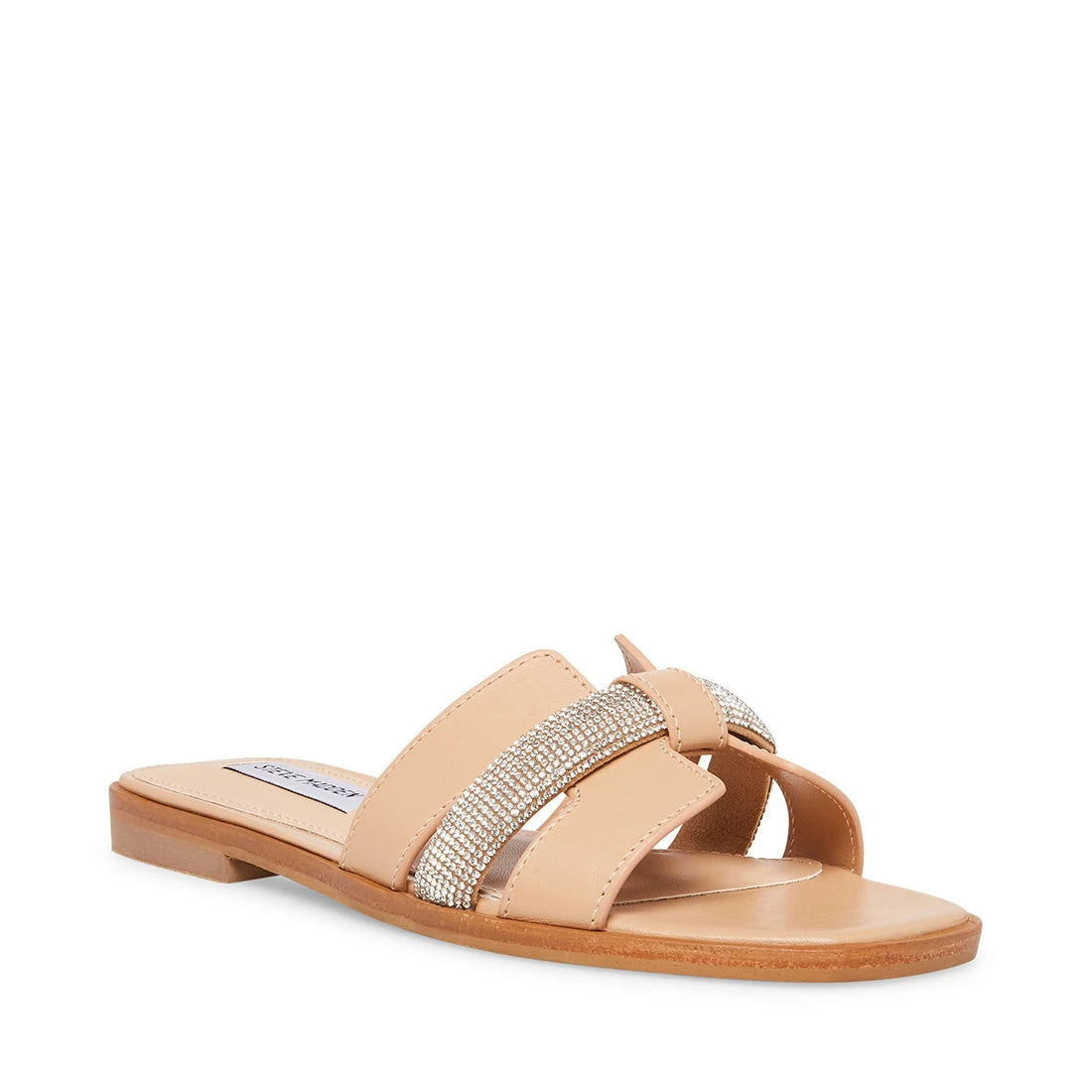 The HOLLI slides feature cut out leather straps with a rhinestone embellished strap woven through for a raised texture and a sparkly look.