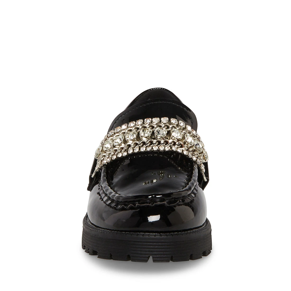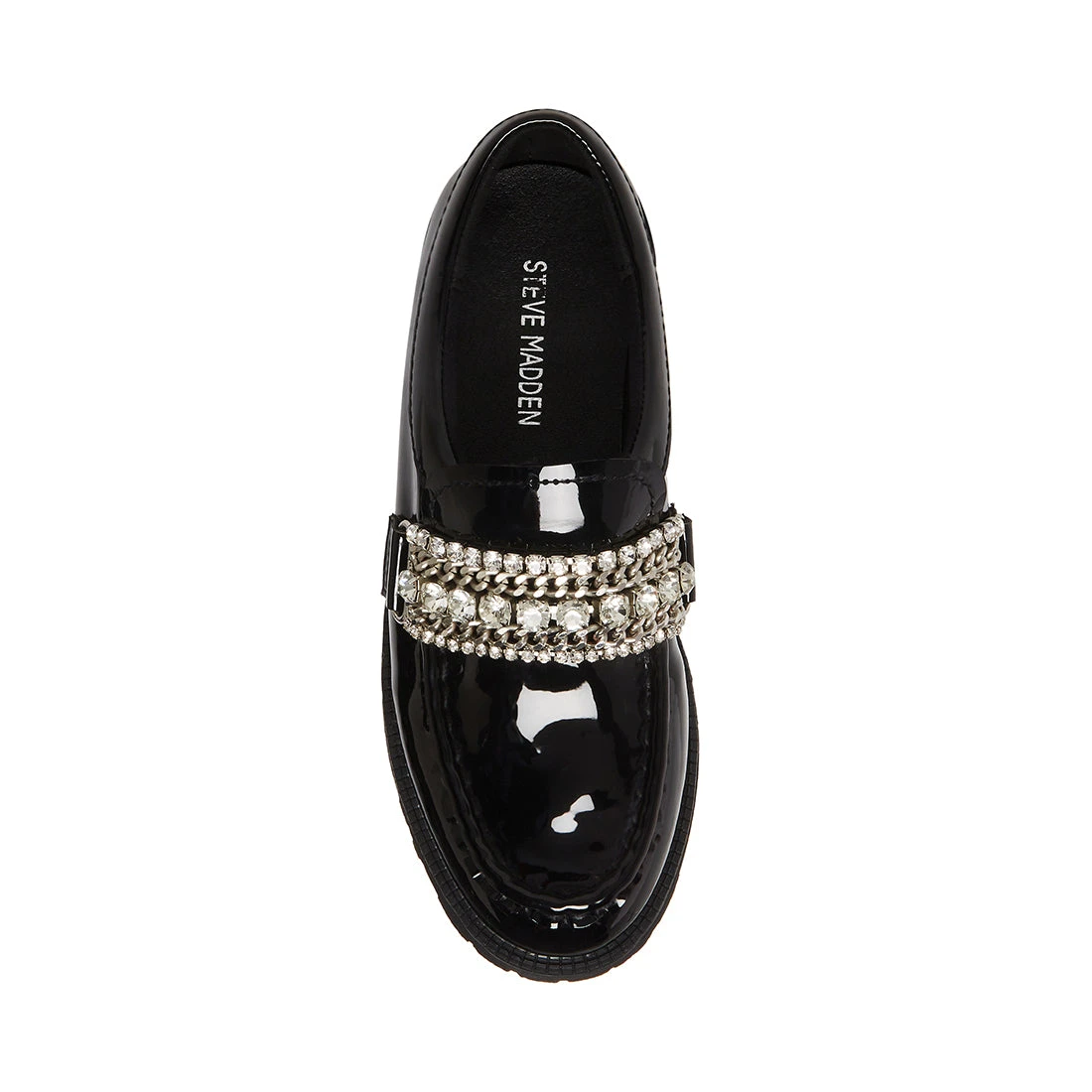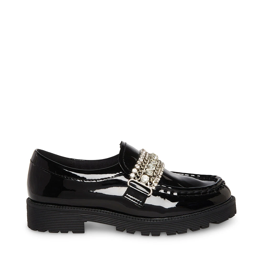 The JMAYBELL moc toe loafer contrasts a heavy treaded sole with a sparkling rhinestone embellishment at the top. The high-shine patent finish brings the look together.