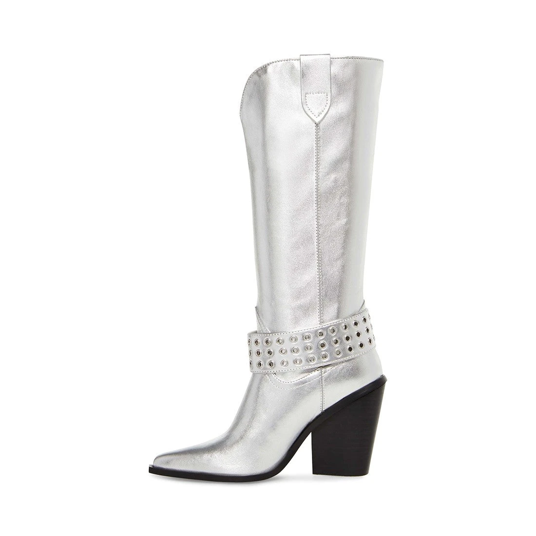 The LENNON knee boots feature a pointed toe and an angled block heel for a cowboy-inspired silhouette with a grommeted strap buckled around the ankle to finish the look.