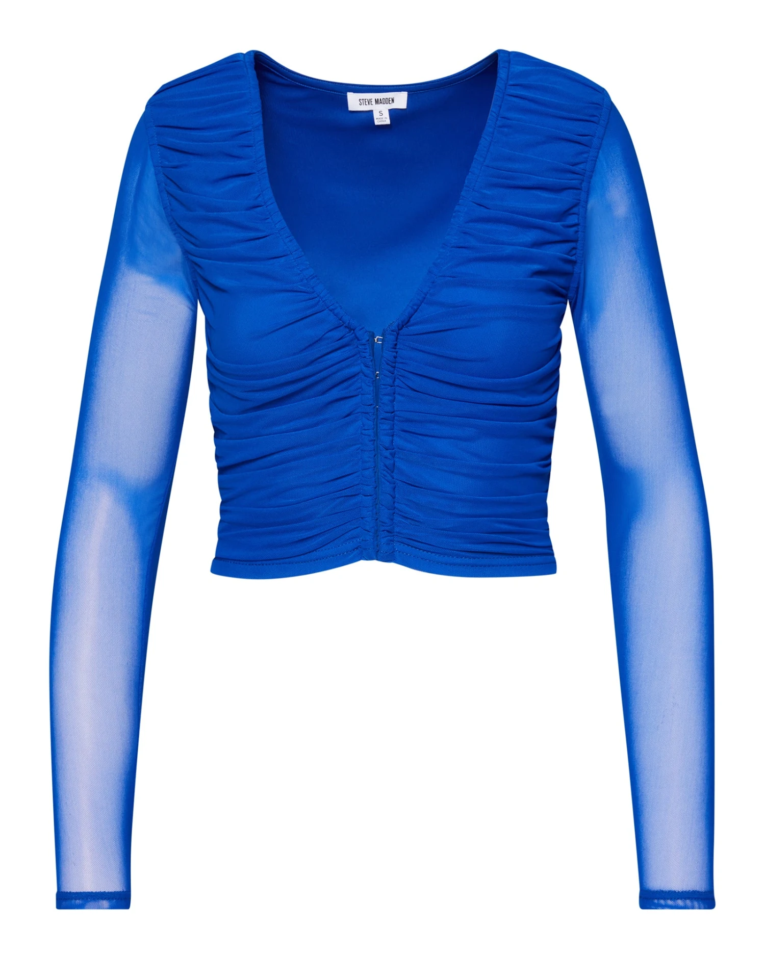 The LUNA mesh top is designed with flattering ruching around the deep V neckline and along the hook-and-eye closure down the front.