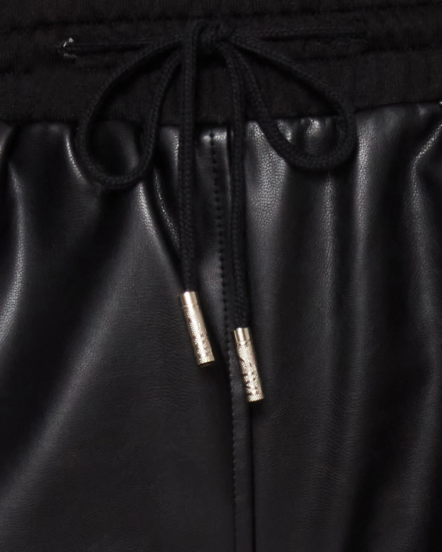 The MARIA pants are a jogger design done in vegan leather with elastic in the waist and cuffs.