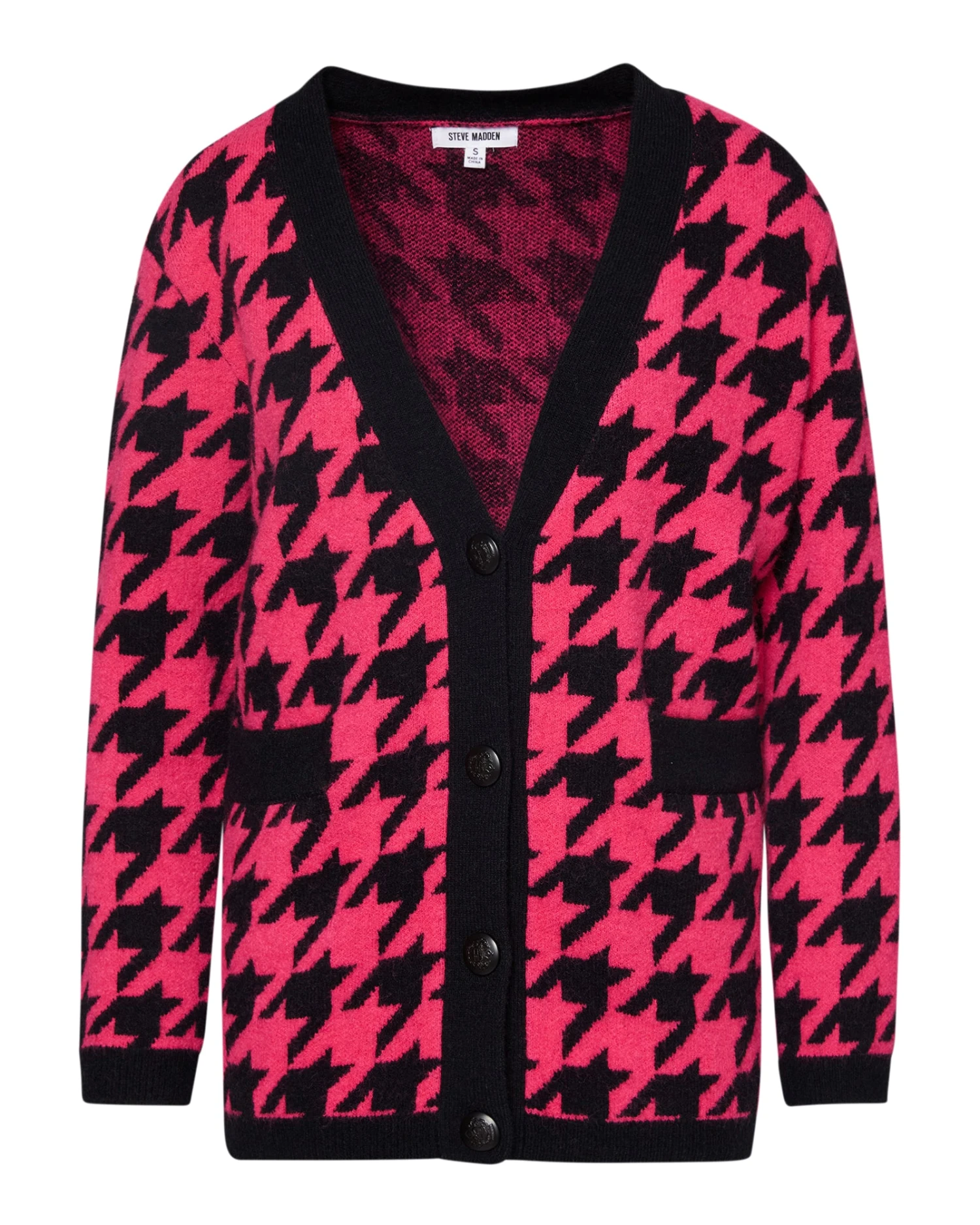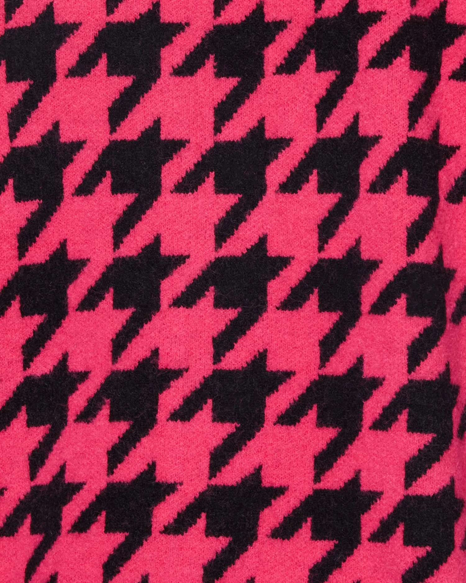 MARINA is a fuzzy oversized sweater in a houndstooth pattern with solid trim on the cuffs, collar, and waistband.