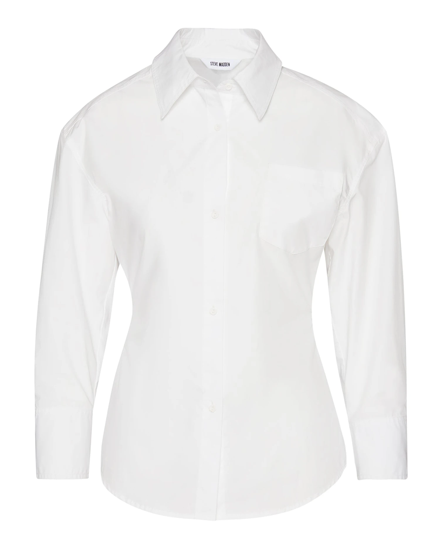 The NADIA button front shirt uses crisp poplin fabric and shoulder padding to cut a sharp, tailored silhouette.
