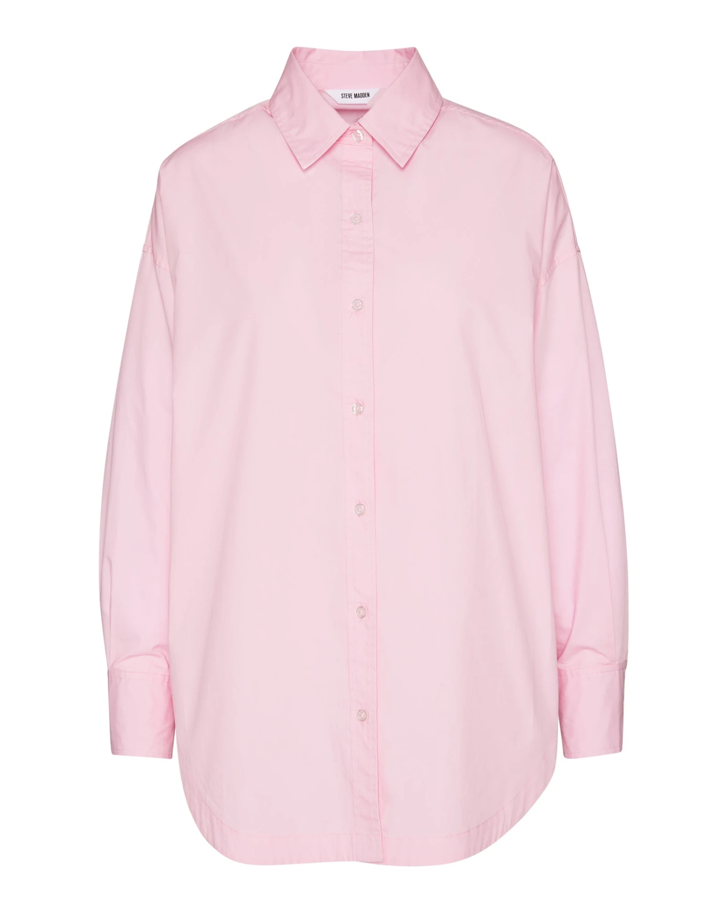 The cotton poplin POPPY top is a collared button-front shirt designed for easy layering with a loose and draped fit.
