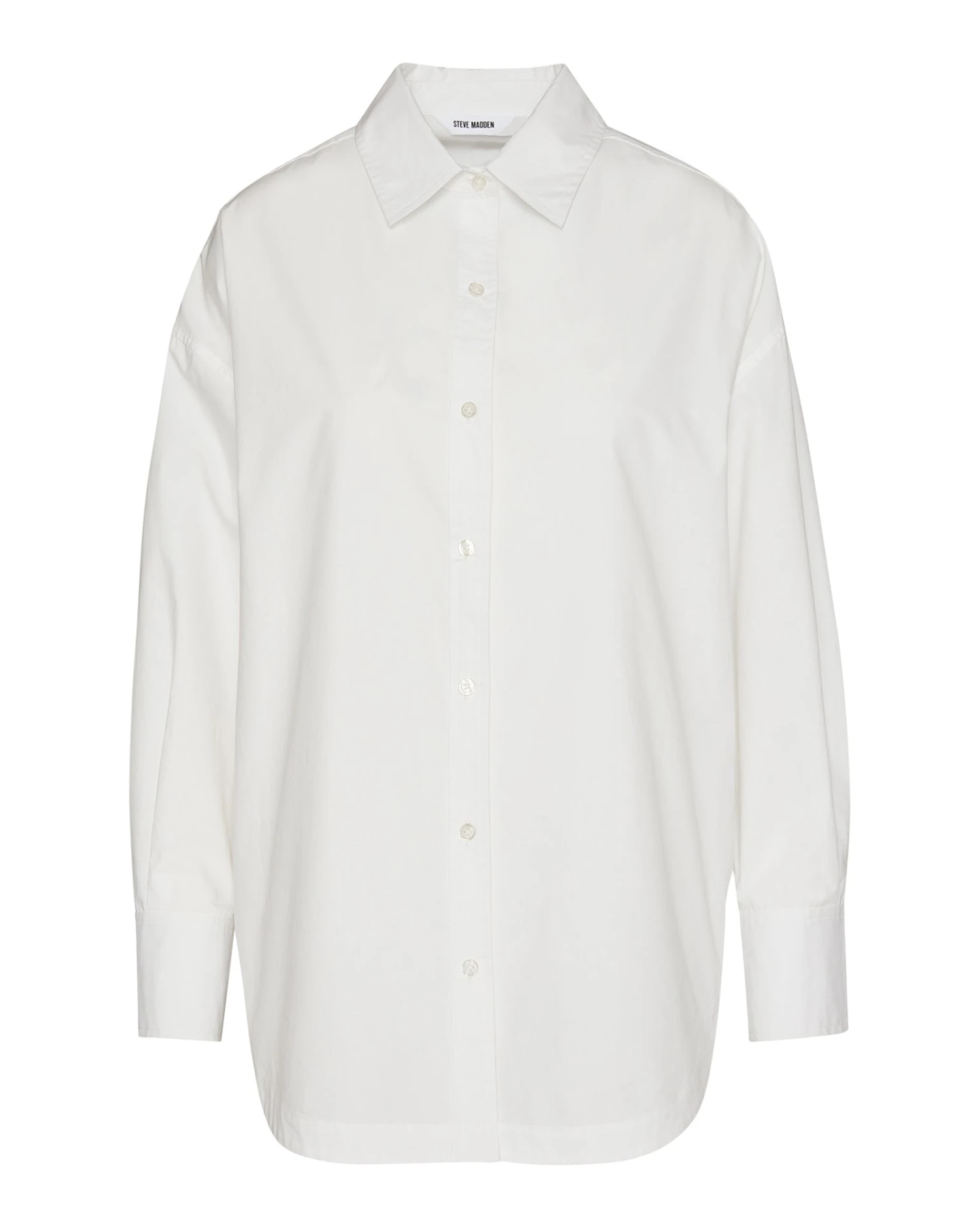 The cotton poplin POPPY top is a collared button-front shirt designed for easy layering with a loose and draped fit.