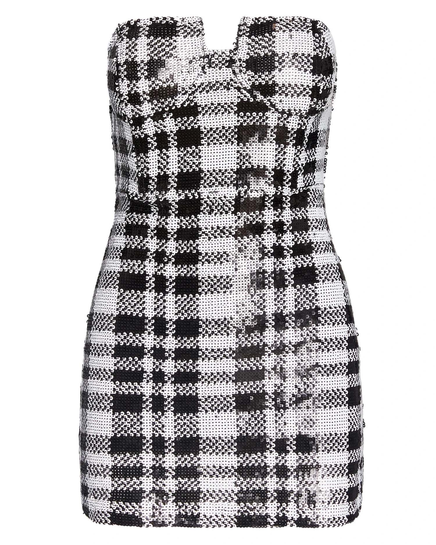 The RETA mini dress features a sleeveless notched neckline and a plaid patterned sequin finish.