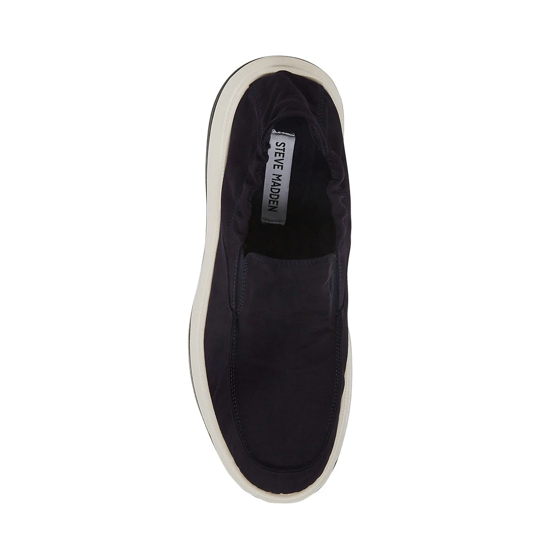 SONNY is a casual slip-on shoe with a buttery soft stretch fabric construction, a moccasin seam around the top, and a wide rubber sole.